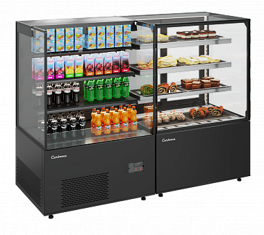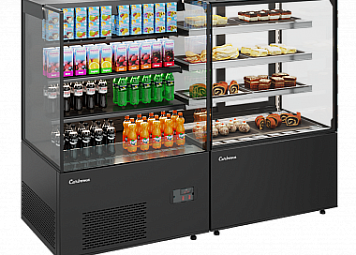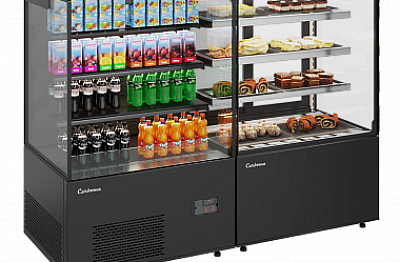 - Кондитерские витрины. Как следует из названия, оборудование этого типа предназначено для выкладки и временного хранения кондитерских изделий: тортов, пирожных и др. Также в этих витринах можно размещать освежающие напитки.