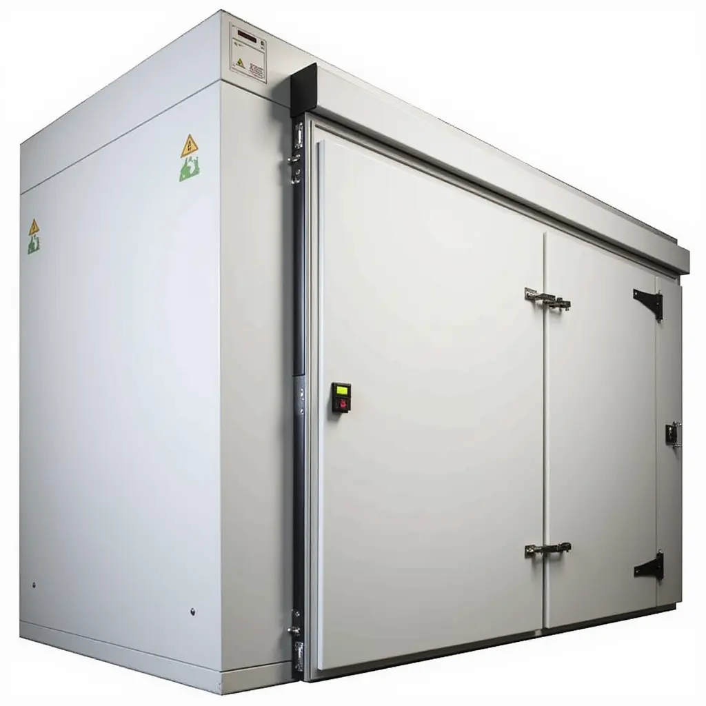 Основу конструкции составляют сэндвич-панели с наполнителем из пенополиуретана (ППУ) толщиной 80 мм, которые соединяются между собой с помощью надежного «строительного замка». В отличие от стандартных камер с ПВХ-замками, данная модель обладает повышенной жесткостью и долговечностью, что делает её идеальным решением для профессиональной эксплуатации в условиях высоких нагрузок.