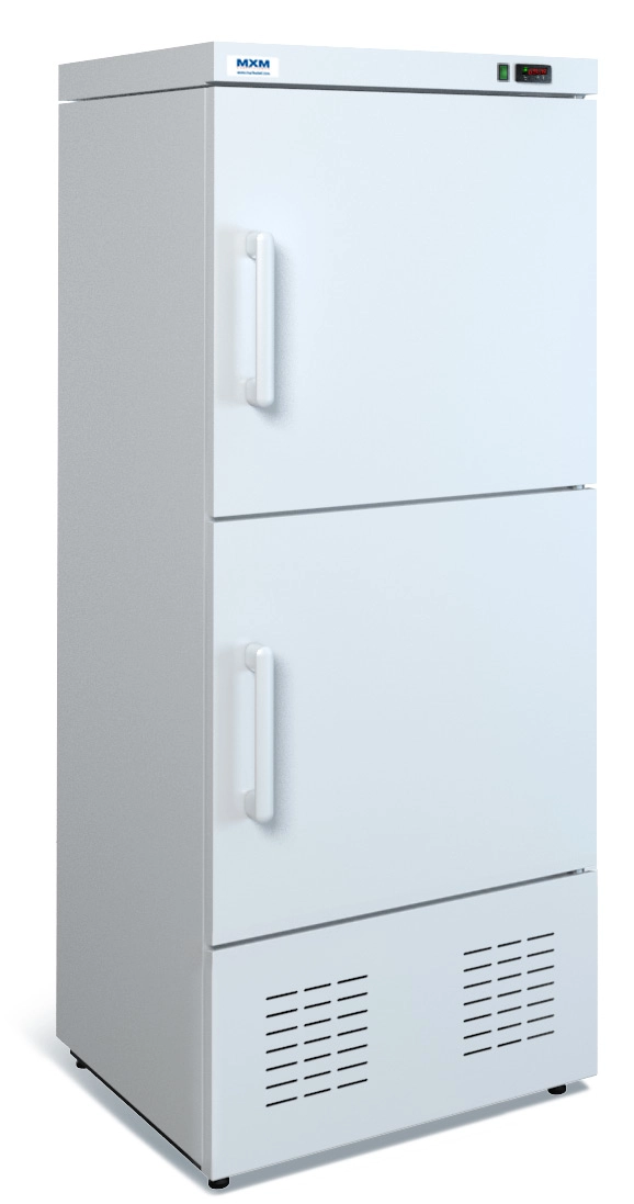 Модель оснащена двумя независимыми отделениями с глухими металлическими дверями, что позволяет одновременно хранить охлажденные и замороженные продукты, экономя пространство в помещении.