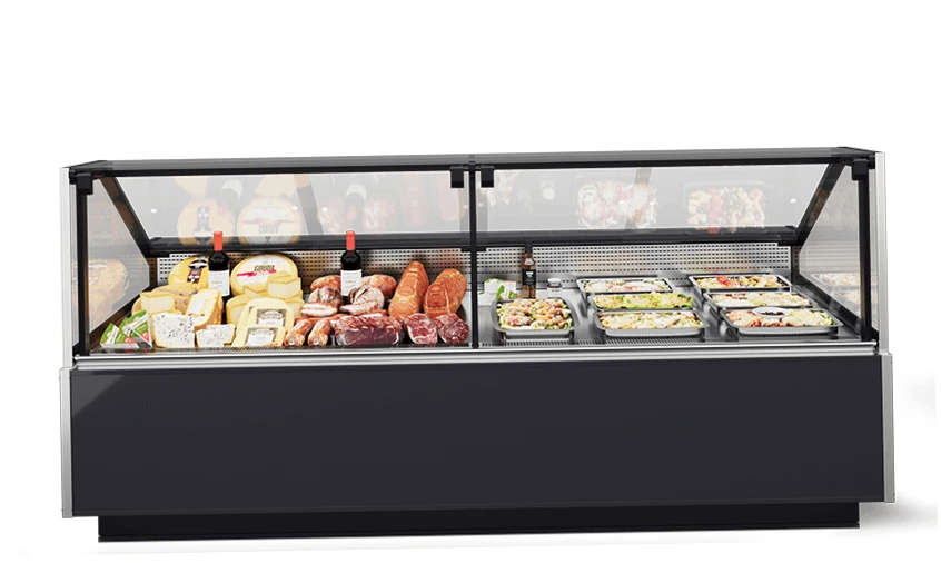 - Закаленное стекло на гидролифтах — фронтальное остекление легко поднимается, что значительно упрощает процесс выкладки товара и ежедневную очистку.